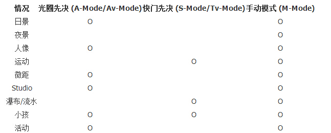 新手们常常会使用Auto、P-Mode等,其实专业摄影师不会用这些模式,反而会使用A-Mode、S-Mode(Tv-Mode)、M-Mode等,好让摄影师有更大的控制权力,拍出心目中理想的相片,这个列表列举出建议使用这些模式的时间(按情况,不一定都会这样使用):